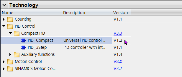 Toimilohkon version voi valita ohjelmointitilan Insctructions välilehden kohdasta Technology -> PID Control -> Compact PID: