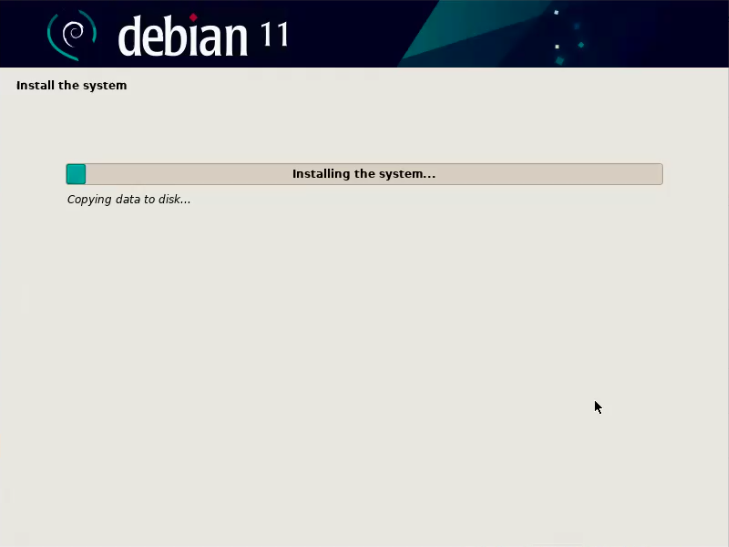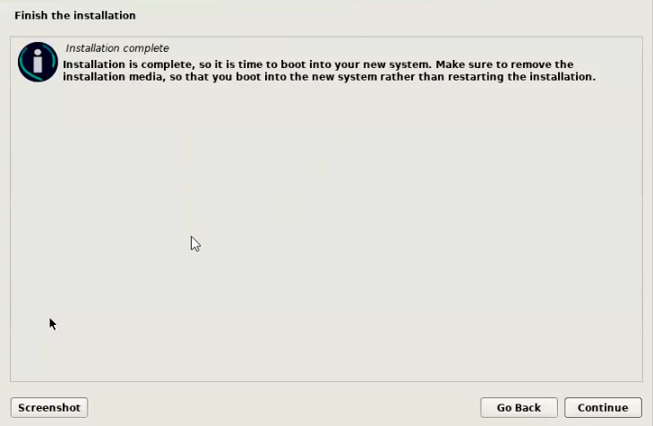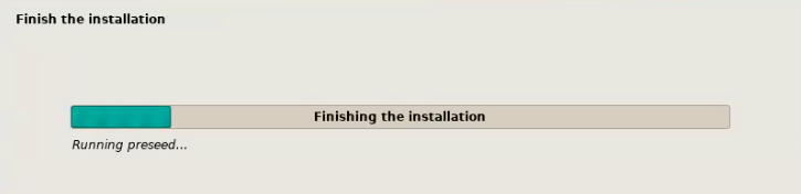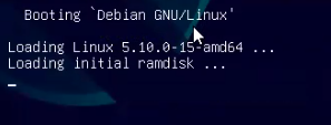 - Asennusohjelma siivoaa jälkensä, minkä jälkeen virtuaalikone käynnistyy uudelleen; tällä kertaa GRUBiin, jossa voidaan valita käynnistettävä käyttöjärjestelmä. Debian GNU/Linux on oletuksena valittu ja se käynnistyy automaattisesti viiden sekunnin kuluttua.