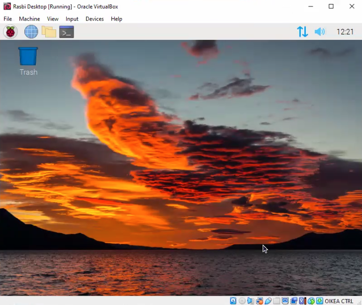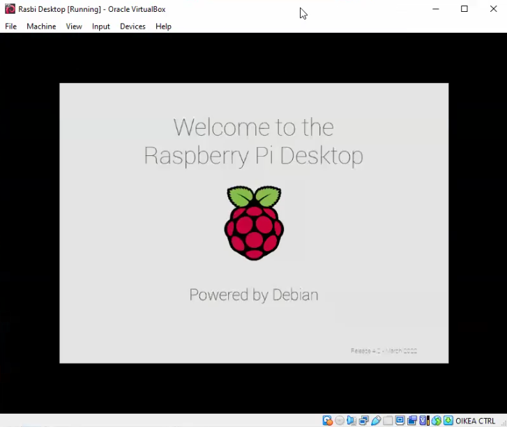 - Uudelleenkäynnistyksen jälkeen näyttää tältä. Huomaa, että yläreunan valikot File, Machine, View, Input, Devices ja Help sekä alareunan pienet kuvakkeet ovat VirtualBoxin toiminteita varten. Yläreunan vadelma-, maapallo- ja muut kuvakkeet taasen ovat virtuaalikoneen, tässä tapauksessa siis virtuaalisen Raspberryn valikoita.