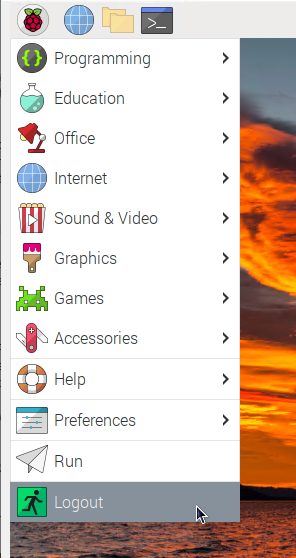 - Voit kokeilla Raspberryn ohjelmia klikkaamalla kuvakkeista. Sulje lopuksi Raspberry Pi Desktop klikkaamalla vadelmavalikon kohdasta Logout ja valitsemalla Shutdown, jolloin kirjaudut ulos ja virtuaalikoneesta "menee sähköt pois päältä".