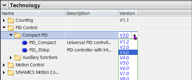 Toimilohkon version voi valita ohjelmointitilan Insctructions välilehden kohdasta Technology -> PID Control -> Compact PID: